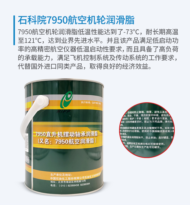 7950航空機輪潤滑脂 適用于直升機自動傾斜儀大滾珠軸承, 適用于小幅度擺動軸承、大滾珠軸承等部位的潤滑,使用溫度-60℃~71℃,