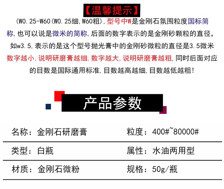 金剛石研磨膏適用于翡翠、瑪瑙、水晶、玉石,琥珀等工藝品、陶瓷硬質合金等高硬度材料制品的量具、刃具光學儀器及其他高光潔度工件的研磨,拋光加工。